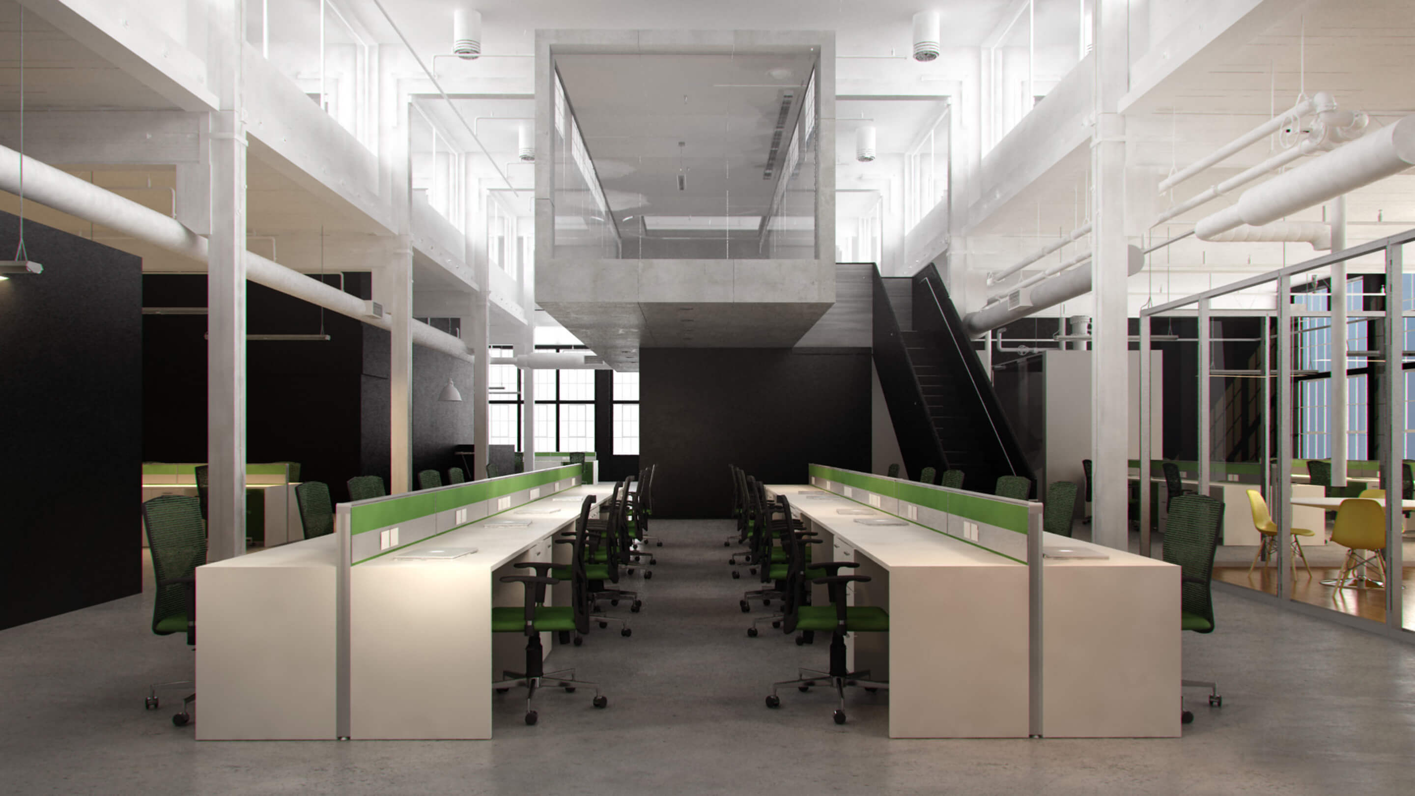 Pensado bajo el concepto de fexibilidad, logrando la apertura total y el máximo aprovechamiento de espacios, creando total interconexión de las áreas operativas y gerenciales.